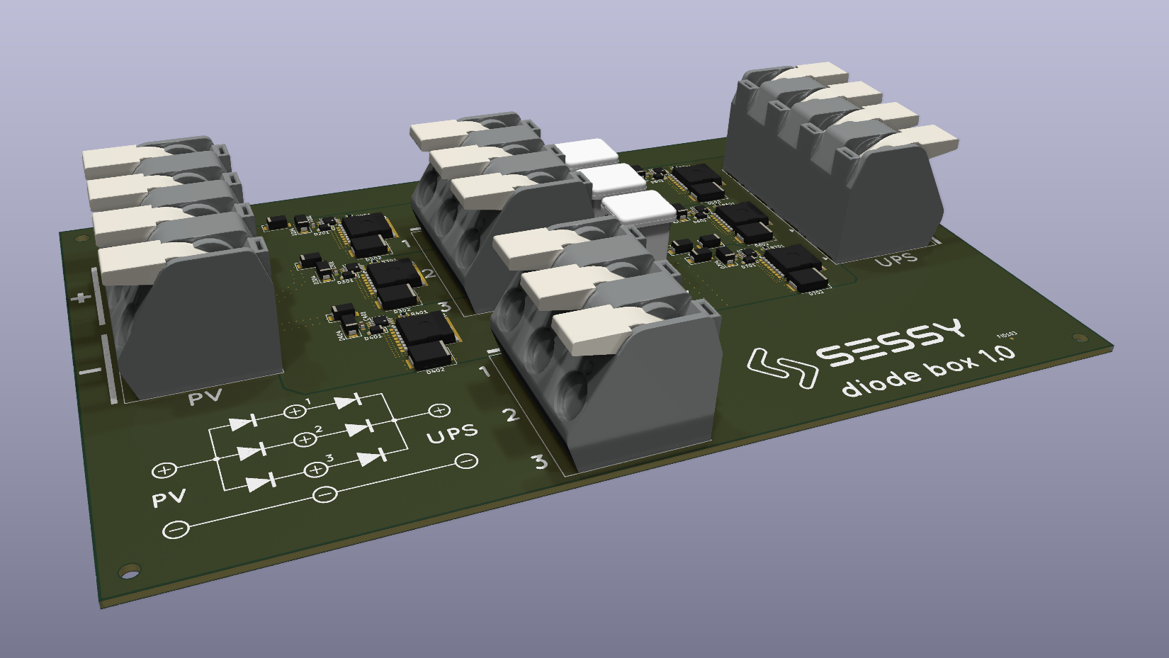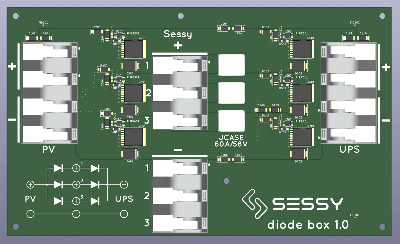 We hebben nu even een klein beetje ruimte aan de hardware ontwikkel kant en zijn daarom bezig met een klein aluminium kastje met een PCB erin, met daarop geen gewone diodes maar 'ideale' diodes. Met als doel de aansluiting van maximaal 3 Sessy’s in parallel op de off-grid omvormer én eventueel de MPPT een stuk netter en eenvoudiger maken.