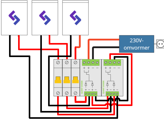 @tuxxie Dit is inderdaad ook een mogelijkheid, nadeel van mijn schema is inderdaad dat bij twee Sessy's de spanning wat lager zal zijn door de extra diode. Voordeel is wel dat de bedrading wat makkelijker is, alle draden zijn point to point en er zijn geen aftakkingen. Uit ervaring weet ik dat mijn schema wel goed werkt 🙂 Heb onder load (+/- 500W) gemeten dat de extra spanningsval ongeveer 0,3V is. dit valt best wel mee vind ik.