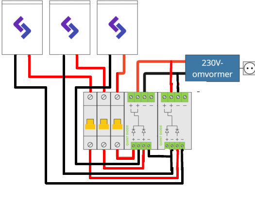 Om dit te bereiken heb ik een externe 48VDC --> 230VAC omvormer gekocht, een Victron Phoenix 800VA ( https://www.victronenergy.com/inverters/phoenix-inverter-vedirect-250va-800va ) Deze omvormer maakt van 48VDC (wat uit de Sessy komt) 230VAC stroom wat je thuis kunt gebruiken voor de koelkast etc... Maar dit werkt maar voor 1 Sessy 🙁 aangezien ik er 3 heb en het mij wel leuk lijkt om ze alle drie te kunnen gebruiken heb ik er ook twee diodes tussen gezet. Diodes zorgen ervoor dat de Sessy's elkaar niet gaan opladen en dat alleen de externe omvormer stroom krijgt. Uiteraard ook wat automaten om de Sessy's en de omvormer te beschermen. Dit boodschappen lijstje bij Sessy neergelegd om te kijken of het gaat werken en dat deed het 😀