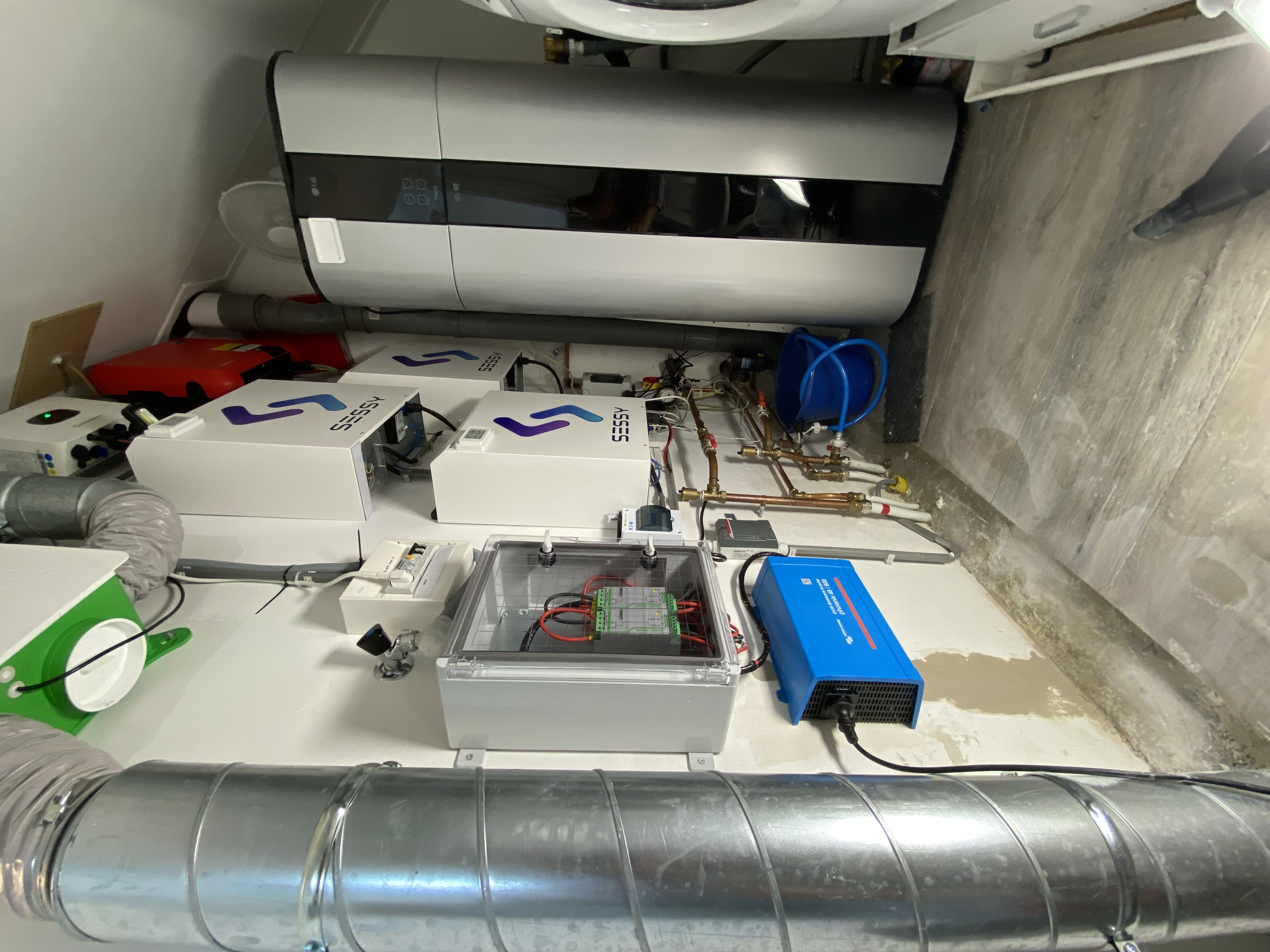 Na heel hier te hebben gelezen antwoord gekregen te hebben op de vragen die ik nog had ging het installeren redelijk soepel. Alleen bij het laatste gaatje wat in de muur geboord moes worden ging het mis, water leiding net geraakt Snel water afgesloten naar de bouwmarkt voor een reparatie sok en nog wat benodigd gereedschap was de klus snel geklaard, direct muur weer gerepareerd. Victron aan de muur aangesloten en toen de Sessy's volgens de handleiding gekoppeld.