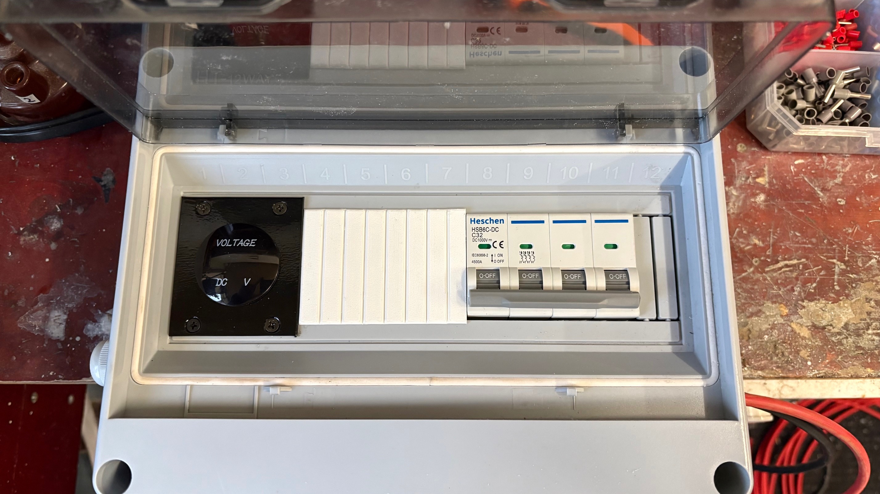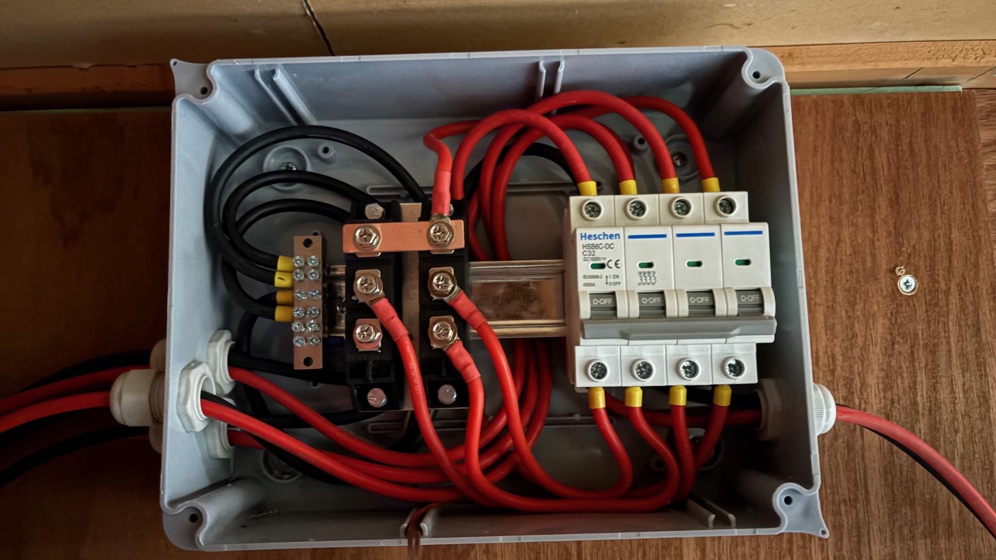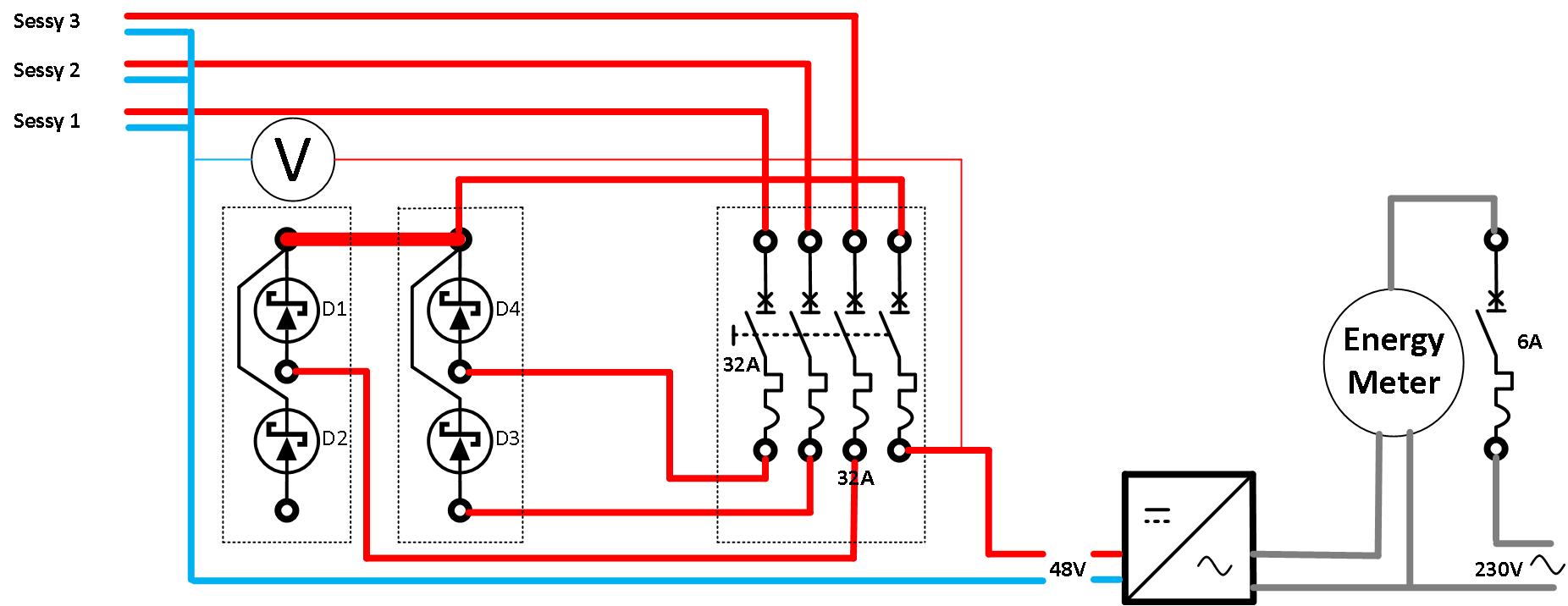 In de Sessybox worden de 3 Sessy poorten van 48V aan elkaar gekoppeld d.m.v. Schottky diodes en een zekering automaat. De automaat zekerd de afzonderlijke Sessy en vervolgens ook de uitgang zodat zowel de in als uitgaander spanning/stroom is gezekerd. De uitgang gaat vervolgens naar een omvormer die de 48V gelijkstroom omzet naar 230V Wisselstroom. De uitgang heb ik via een connectie box met energie meter en zekering automaat van 6A (6A x 230V = 1320W) beveiligd.