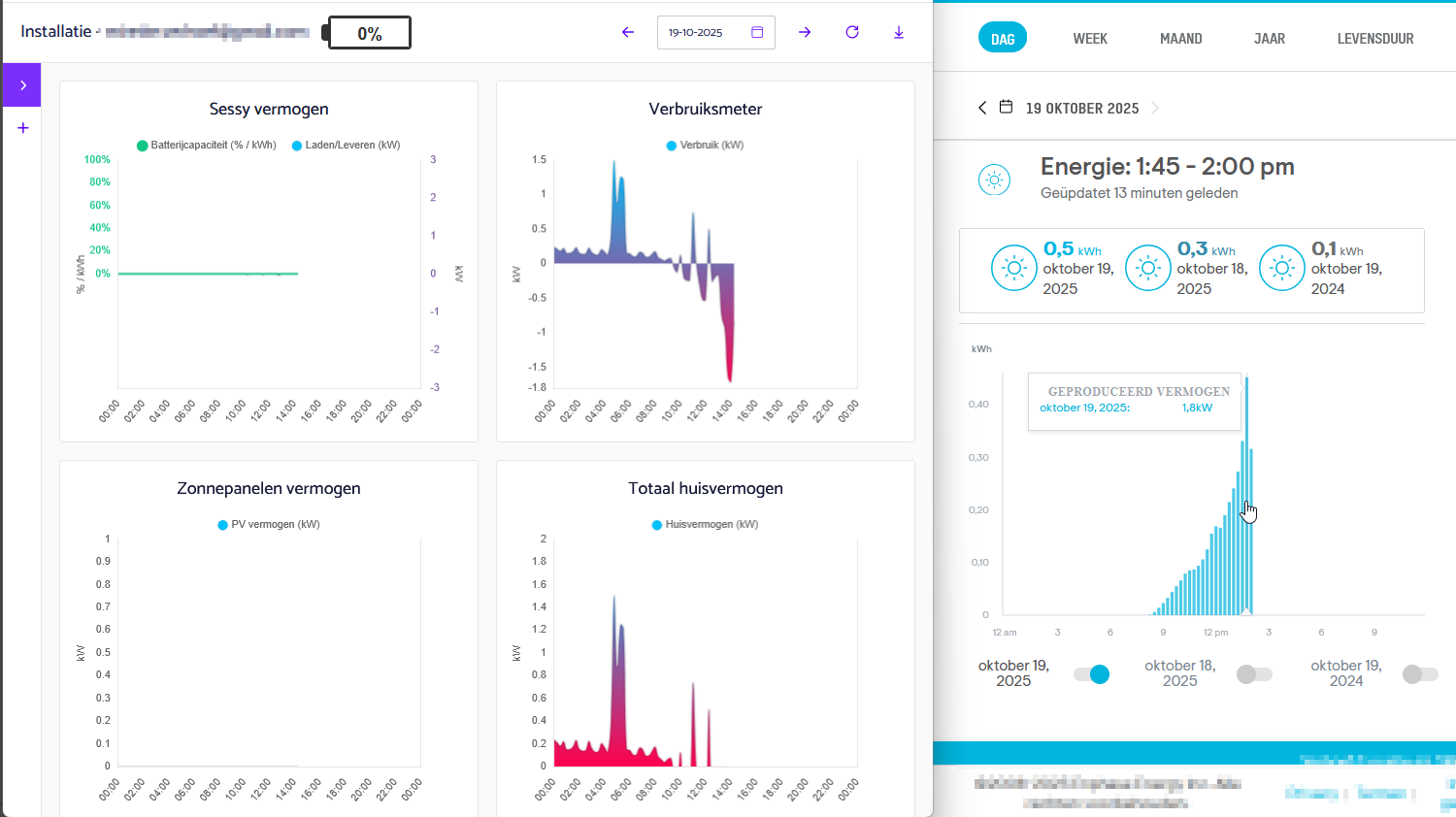 Ja heeft 't sinds het begin gewoon goed gedaan. En er stond/staat een enorme foutenlog, maar die zou niet verklaren waarom de Sessy geen sjoege geeft. Ik heb via mail diverse info doorgezet: foutenlog, pingtests Wifi, opwekgegevens die de omvormers meten, meetgegevens Sessy portal.